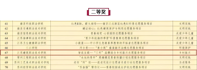 近日,在2025年江苏省高校青年志愿服务项目大赛决赛中,智能制造学院申报的《智农五载——“三科”品牌助力乡村振兴》项目,经过激烈角逐,荣获大赛二等奖。该项目充分彰显了我院青年学子服务国家战略的使命担当和卓越的创新精神。